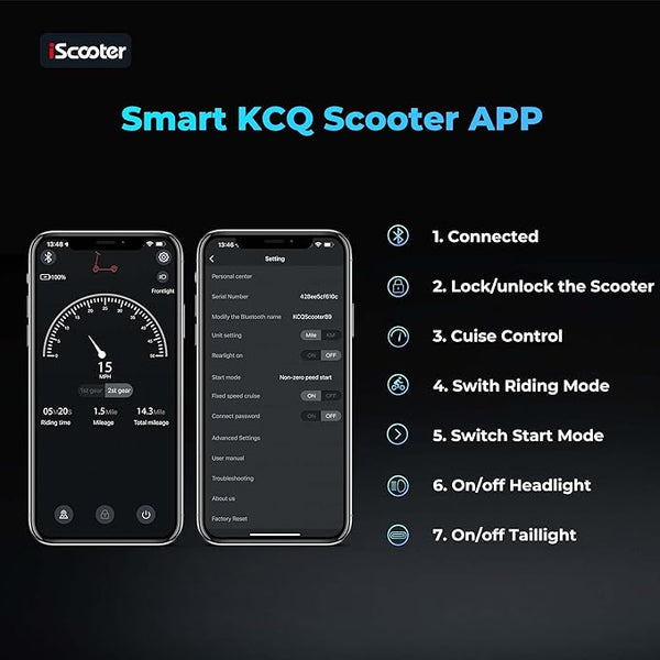 Intelligente App-Steuerung: Mit der intelligenten KCQ-App (für iPhone und Android) können Sie verschiedene Funktionen wie die Einstellung der Höchstgeschwindigkeit, den Geschwindigkeitsregler, das Sperren oder Entsperren des Rollers, das Ein- und Ausschalten der Lichter und vieles mehr über Bluetooth auf Ihrem iPhone oder Android-Gerät steuern. Die multifunktionale App erleichtert mehr denn je die Verwaltung des Elektrorollers über die Smartphone-Steuerung.