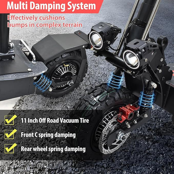 Kräftiger Roller für Erwachsene: Ausgestattet mit leistungsstarken doppelten Motoren von 5600 W und einer maximalen Geschwindigkeit von 80 km/h ist dieser Elektroroller für Erwachsene blitzschnell und gibt den Fahrern ein schnelles Beschleunigungserlebnis. Mit einer maximalen Tragfähigkeit von 200 kg und Unterstützung für steile Hänge von 50° können Sie die Steigung problemlos hoch- und runterfahren. Mit diesem Elektroroller mit Sitz können Sie ihn problemlos für den täglichen Gebrauch oder Offroad-Spaß nutzen.
